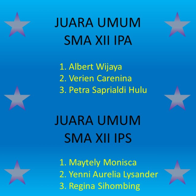 Selamat kepada seluruh peserta didik yang berprestasi, dan mudah-mudahan dapat memberikan semangat yang tinggi. Adapun penghargaan ini diberikan dengan harapan dapat memotivasi seluruh peserta didik dikemudian hari, sehingga persaingan dalam perebutan juara kedepannya nanti diharapkan semakin kompetitif. Hadiah yang diterima sang Juara Umum terdiri dari sertifikat, uang tunai, dan cenderamata.