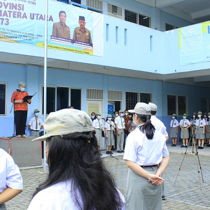 Medan, 2 Mei 2021. Upacara bendera dilakukan secara tatap muka, terbatas, dan tetap menerapkan protokol Kesehatan di Sekolah Methodist 6, Medan. Selain itu juga upacara dilakuakan secara dalam jaringan (daring), yang dapat saksikan melalui Youtube Methodist 6.