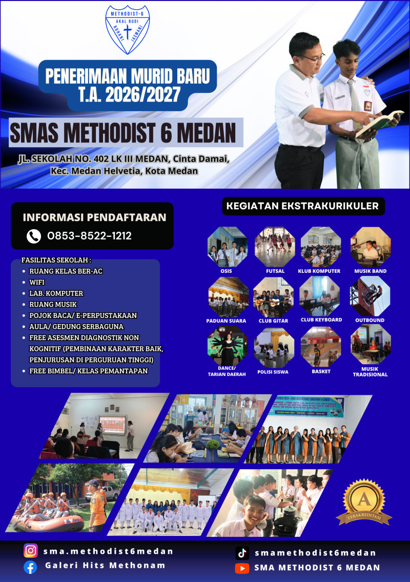 Pendaftaran Online untuk sekolah SMAS Methodist 6 Medan sudah dibuka, mari daftarkan putra/putri Bapak/Ibu menjadi bagian murid di sekolah SMAS Methodist 6 Medan.