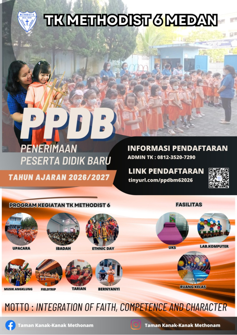 PENERIMAAN PESERTA DIDIK BARU PG/TK METHODIST 6 MEDAN T.P. 2026/2027 PERIODE BULAN APRIL-JUNI 2026